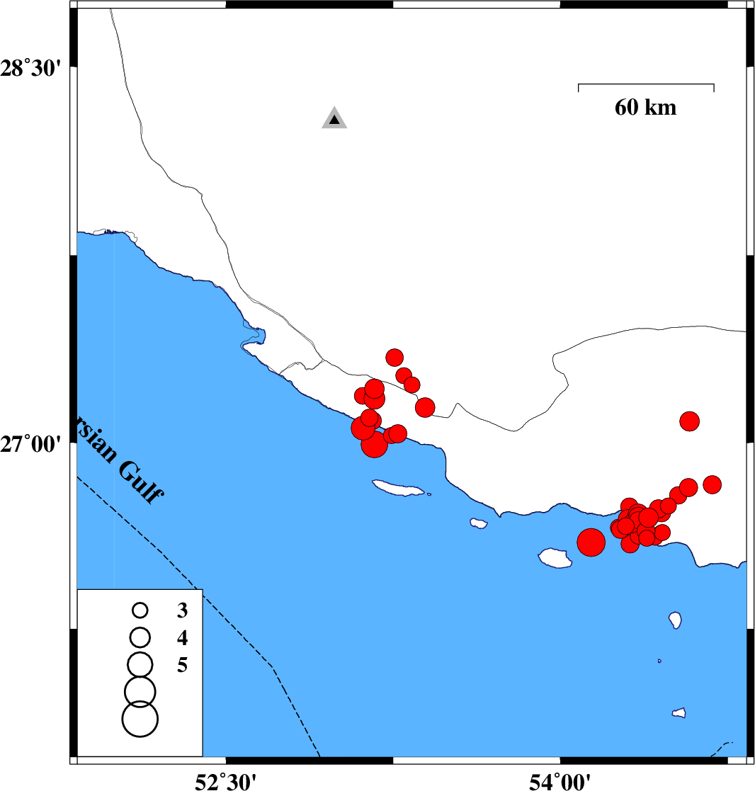 | 2022/06/21 | 07:05:05.4 | 11:35:05.4 | 26.692 | 54.303 | 19 | ML4 | Persian Gulf, 57 km South of Bastak | ||