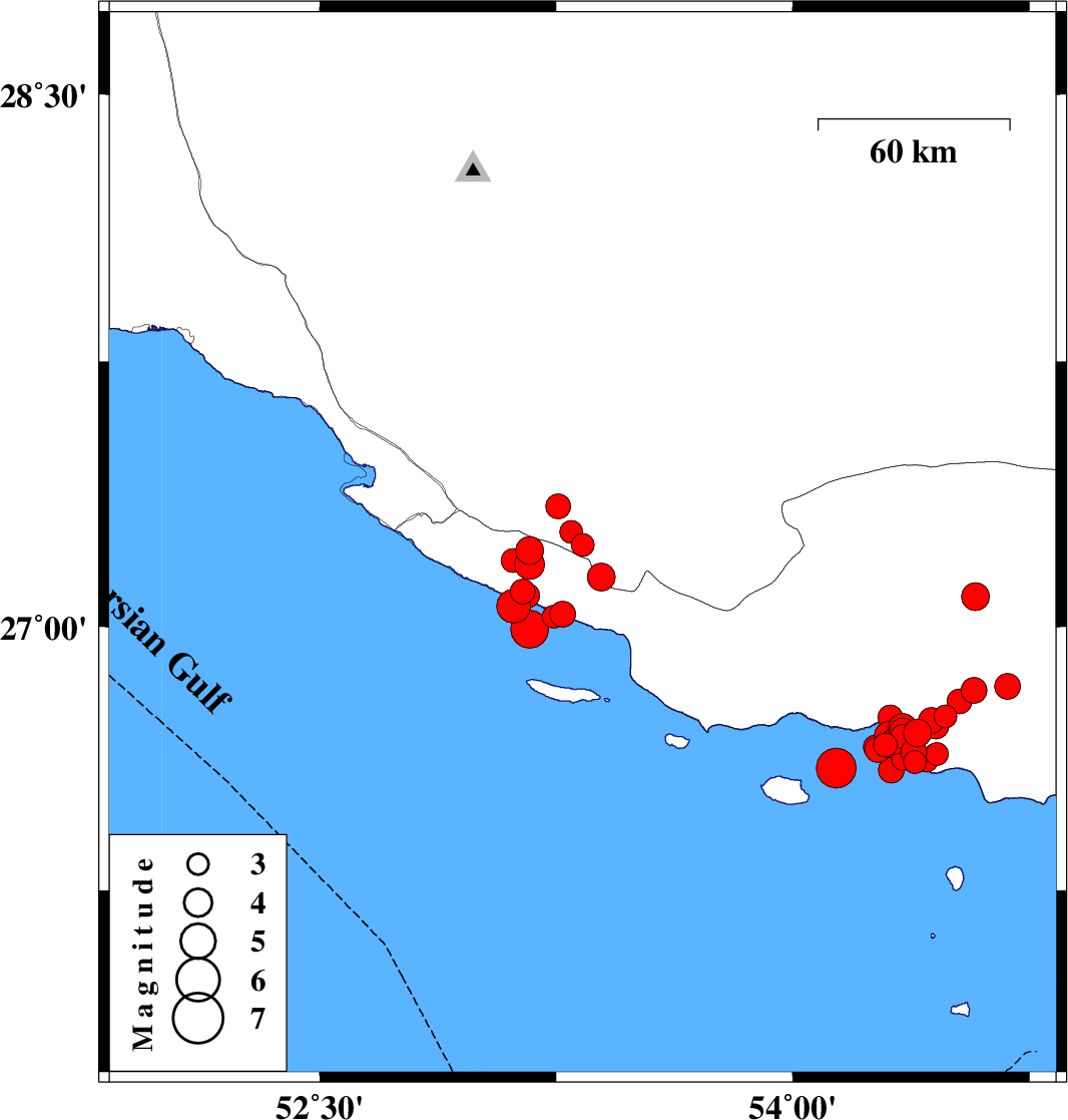 | 2022/06/19 | 09:24:06.4 | 13:54:06.4 | 26.659 | 54.261 | 12 | ML3.4 | Persian Gulf, 61 km South-West of Bastak |