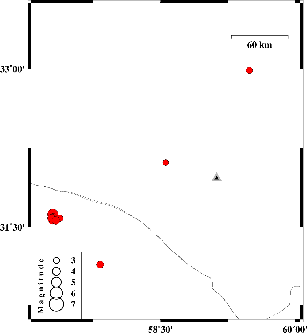 | 2022/06/04 | 20:00:02.2 | 00:30:02.2 | 32.984 | 59.49 | 15 | ML3.2 | Khorasan(south) Province, 26 km -East of Birjand |
