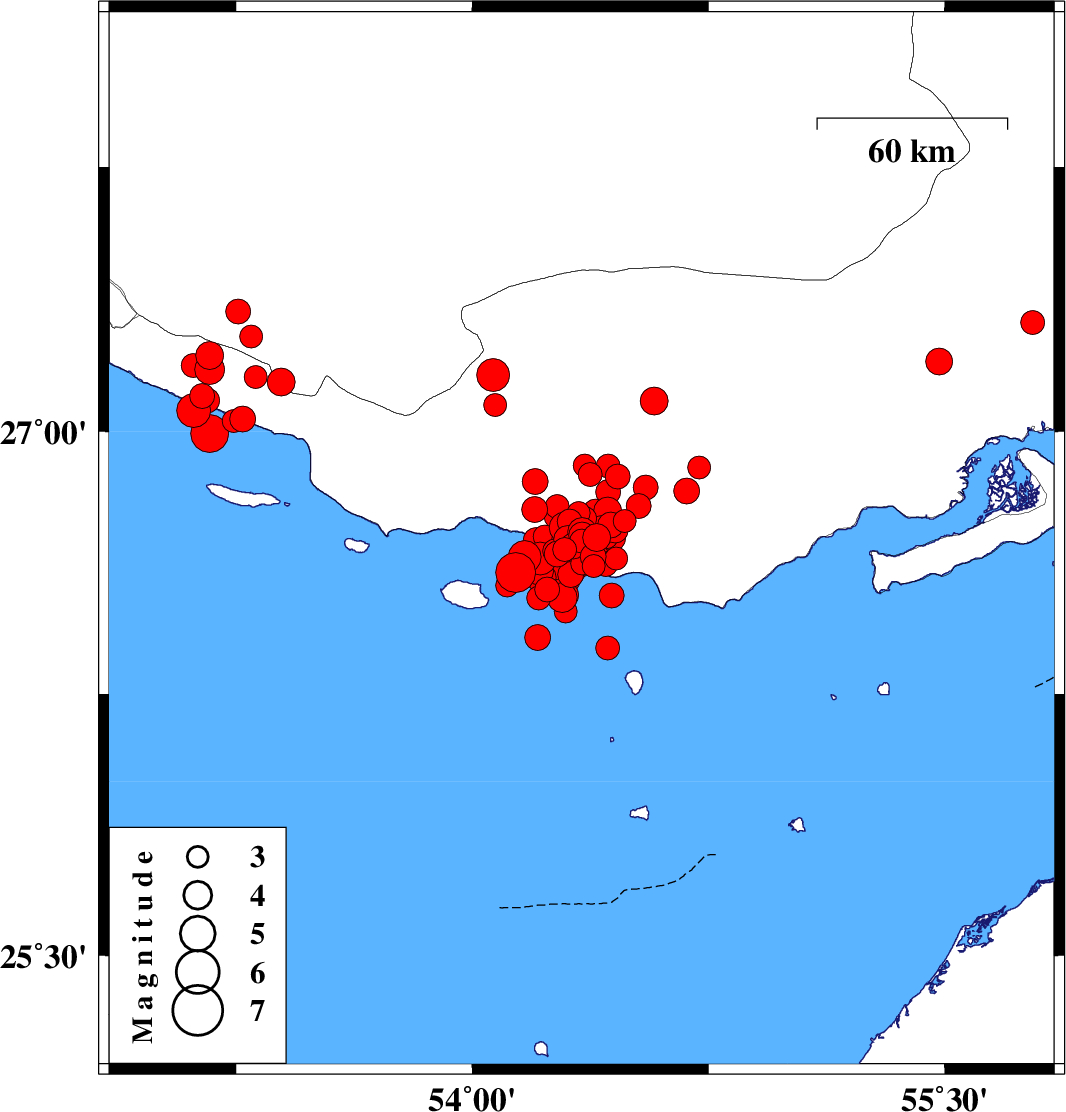 | 2022/06/21 | 07:05:05.4 | 11:35:05.4 | 26.692 | 54.303 | 19 | ML4 | Persian Gulf, 57 km South of Bastak | ||