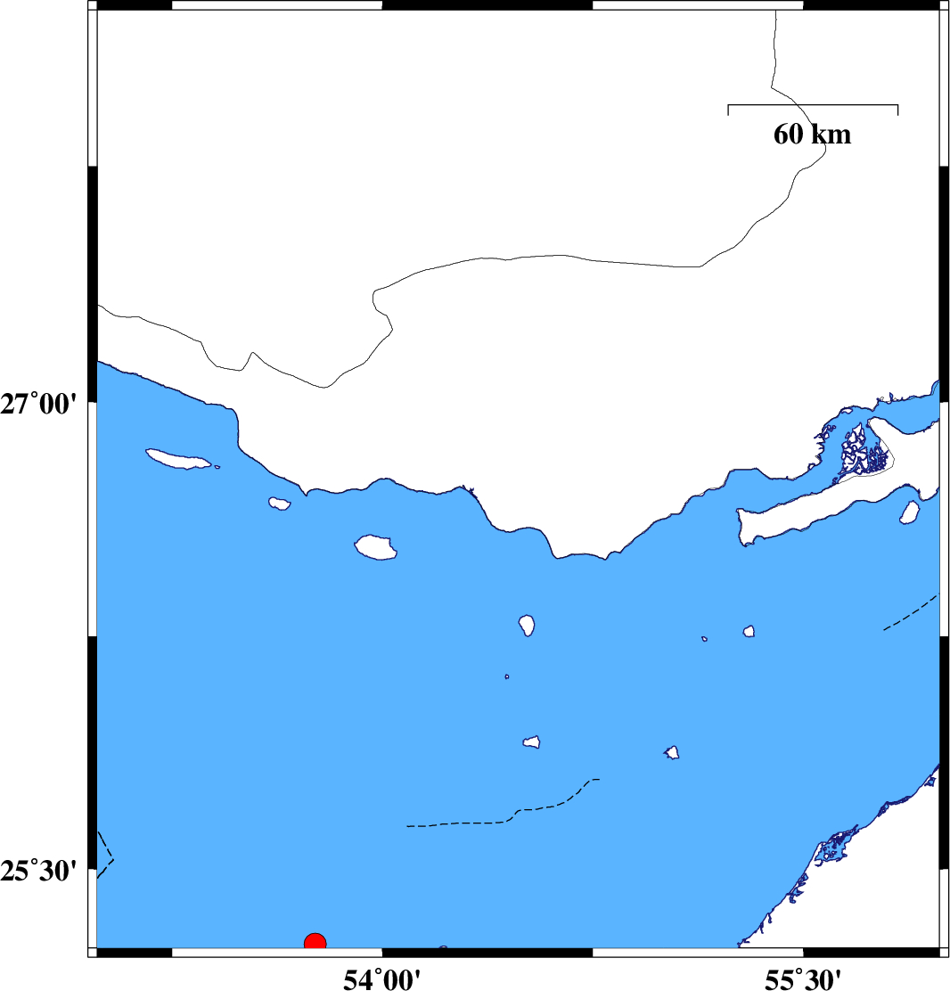 2022/06/16 00:40:46.7 05:10:46.7 26.63854.21512 ML4.7 Persian Gulf, 64 km South-West of Bastak