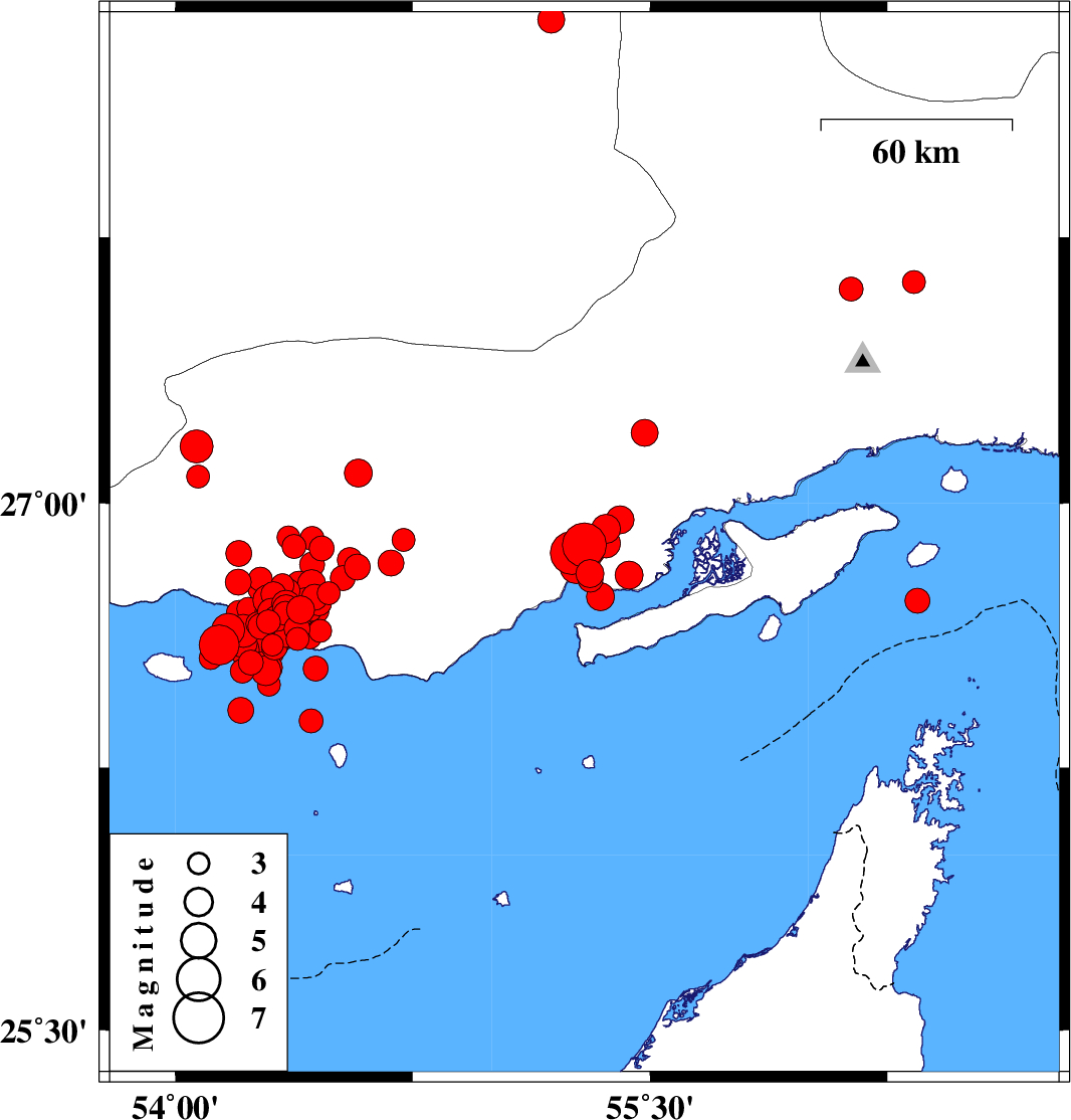 | 2022/06/21 | 07:05:05.4 | 11:35:05.4 | 26.692 | 54.303 | 19 | ML4 | Persian Gulf, 57 km South of Bastak | ||