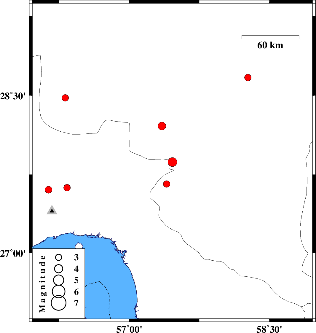 | 2022/07/01 | 14:04:21.1 | 18:34:21.1 | 27.868 | 57.462 | 12 | ML4.4 | Kerman Province, 25 km -West of Kahnuj | ||