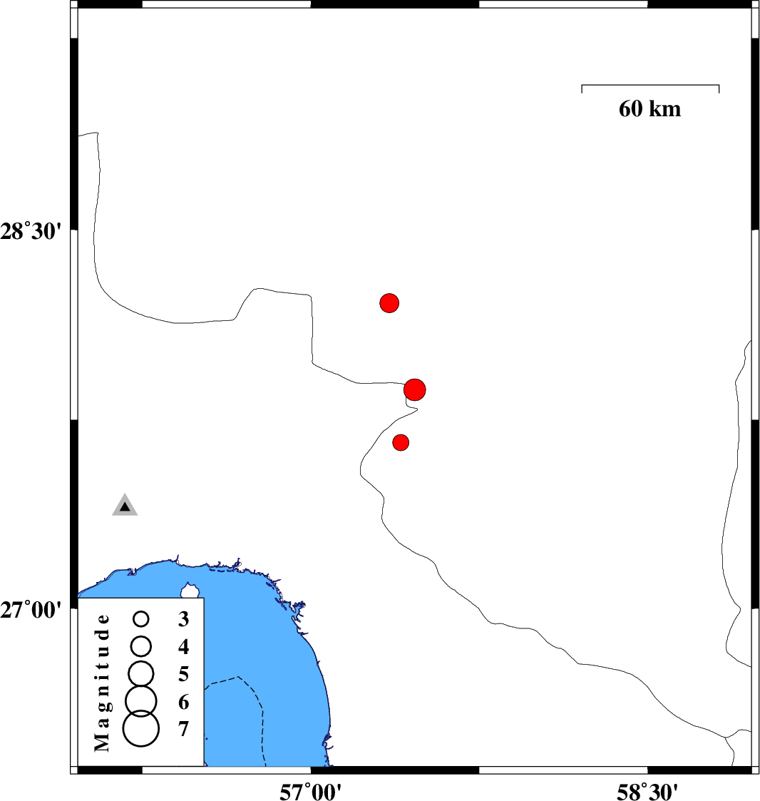 | 2022/07/01 | 19:28:31.4 | 23:58:31.4 | 28.21 | 57.349 | 12 | ML3.8 | Kerman Province, 45 km North-West of Kahnuj | ||