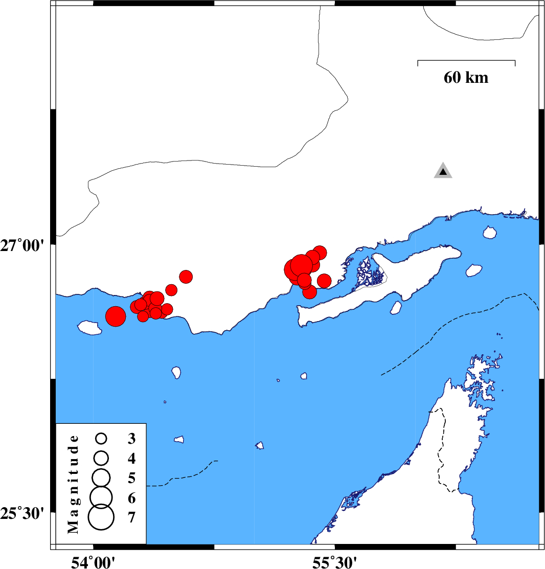 2022/06/24 23:47:23.3 04:17:23.3 26.65154.2712 ML3.7 Persian Gulf, 62 km South of Bastak