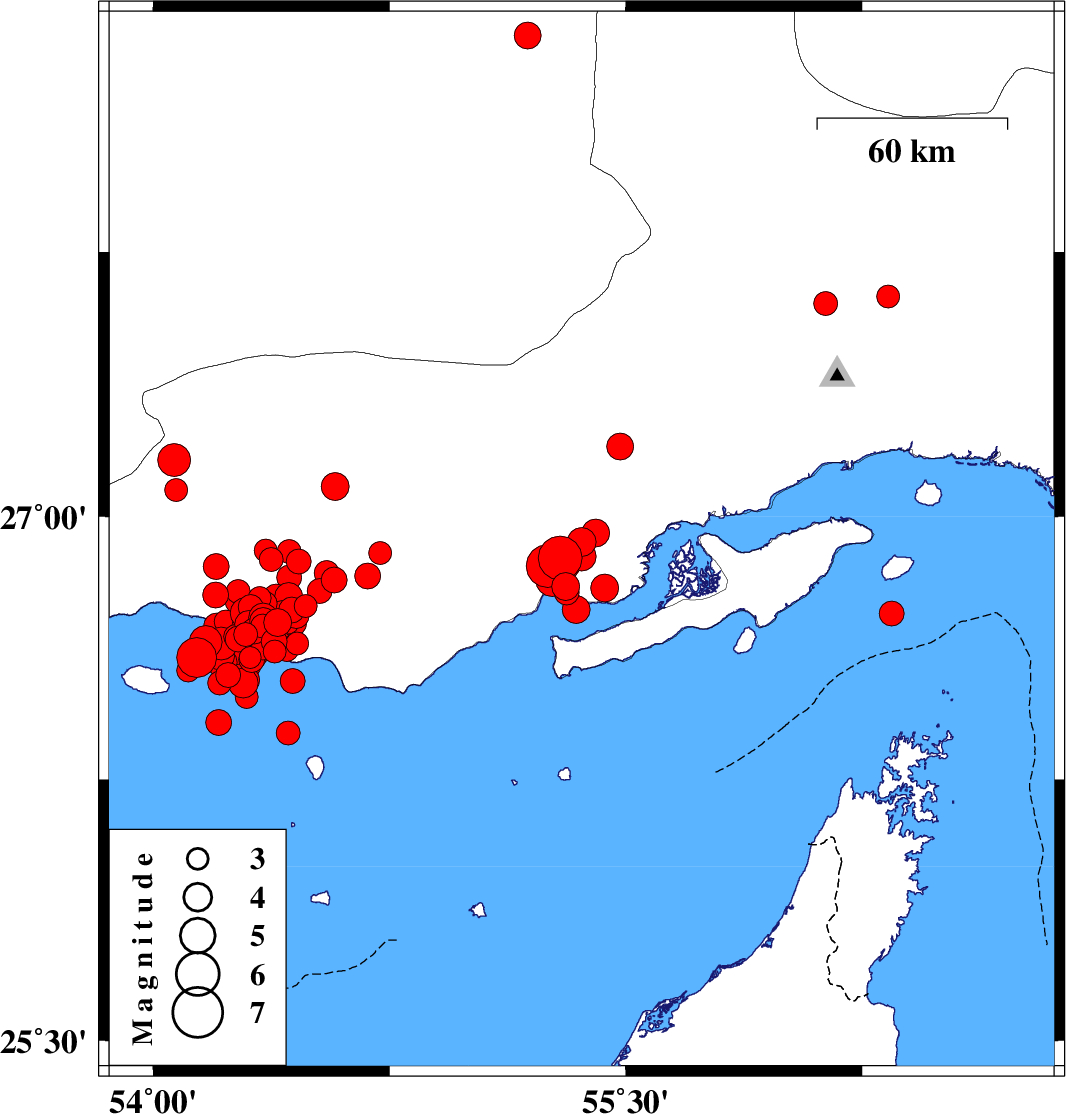 | 2022/06/21 | 07:05:05.4 | 11:35:05.4 | 26.692 | 54.303 | 19 | ML4 | Persian Gulf, 57 km South of Bastak | ||