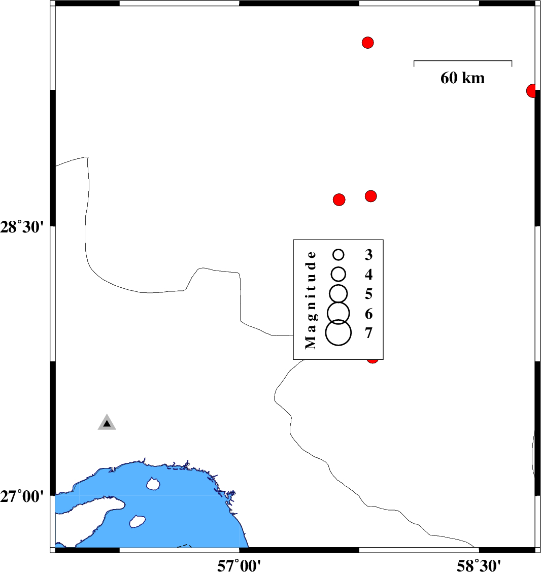 | 2022/07/01 | 13:58:11.4 | 18:28:11.4 | 27.659 | 57.401 | 12 | ML3.3 | Kerman Province, 29 km North of Manujan | ||
