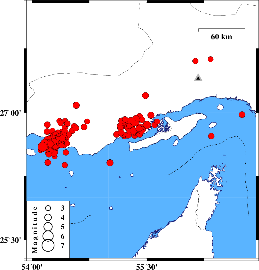 | 2022/06/21 | 07:05:05.4 | 11:35:05.4 | 26.692 | 54.303 | 19 | ML4 | Persian Gulf, 57 km South of Bastak | ||