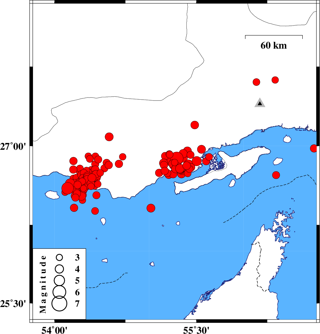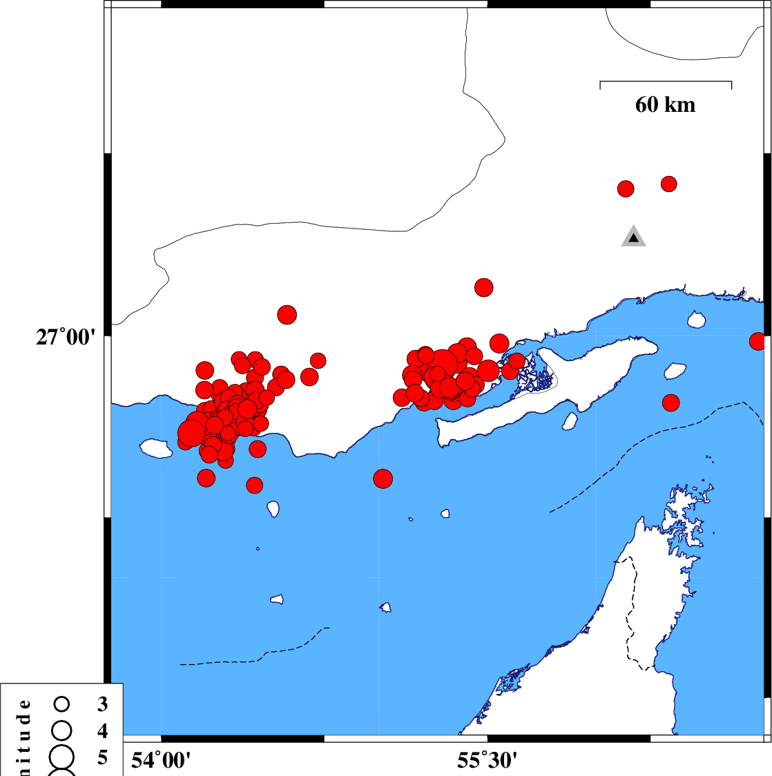 | 2022/06/21 | 07:05:05.4 | 11:35:05.4 | 26.692 | 54.303 | 19 | ML4 | Persian Gulf, 57 km South of Bastak | ||