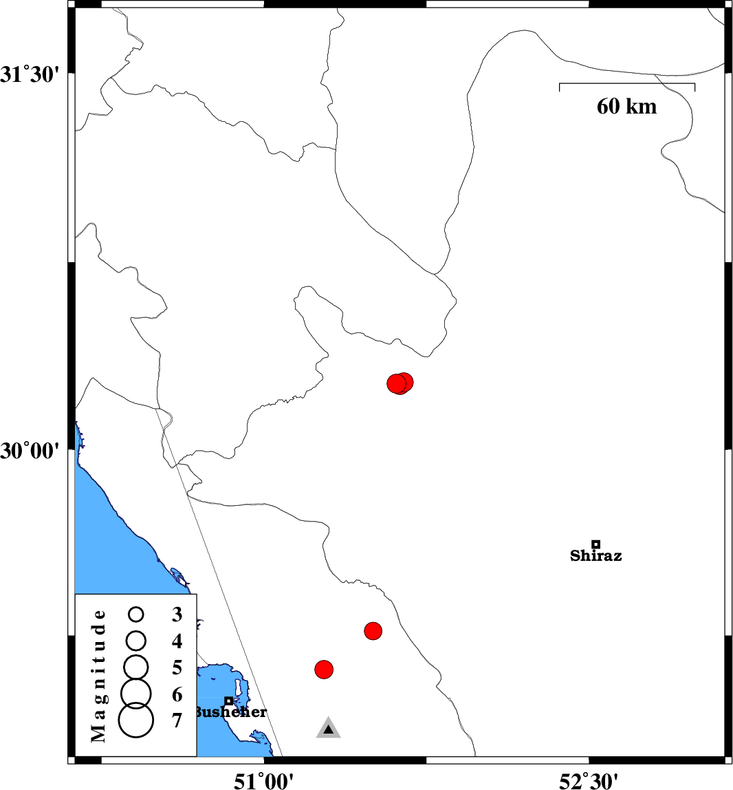 | 2022/06/10 | 09:00:41.8 | 13:30:41.8 | 29.113 | 51.276 | 12 | ML3.8 | Bushehr Province, 18 km South of Borazjan |