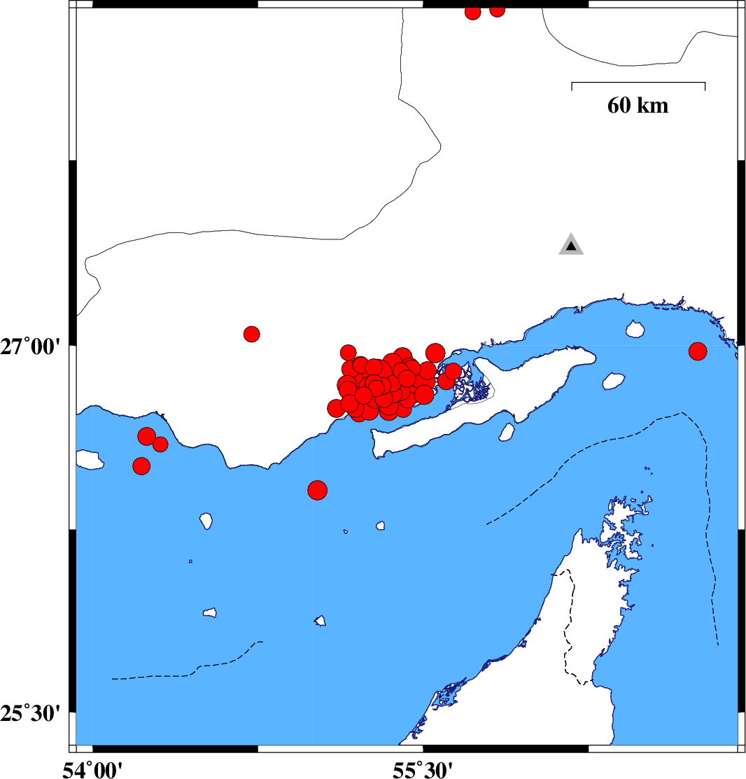 | 2022/07/01 | 00:44:42.6 | 05:14:42.6 | 26.598 | 54.307 | 21 | ML3.1 | Persian Gulf, 54 km -West of Bandar-e lengeh |