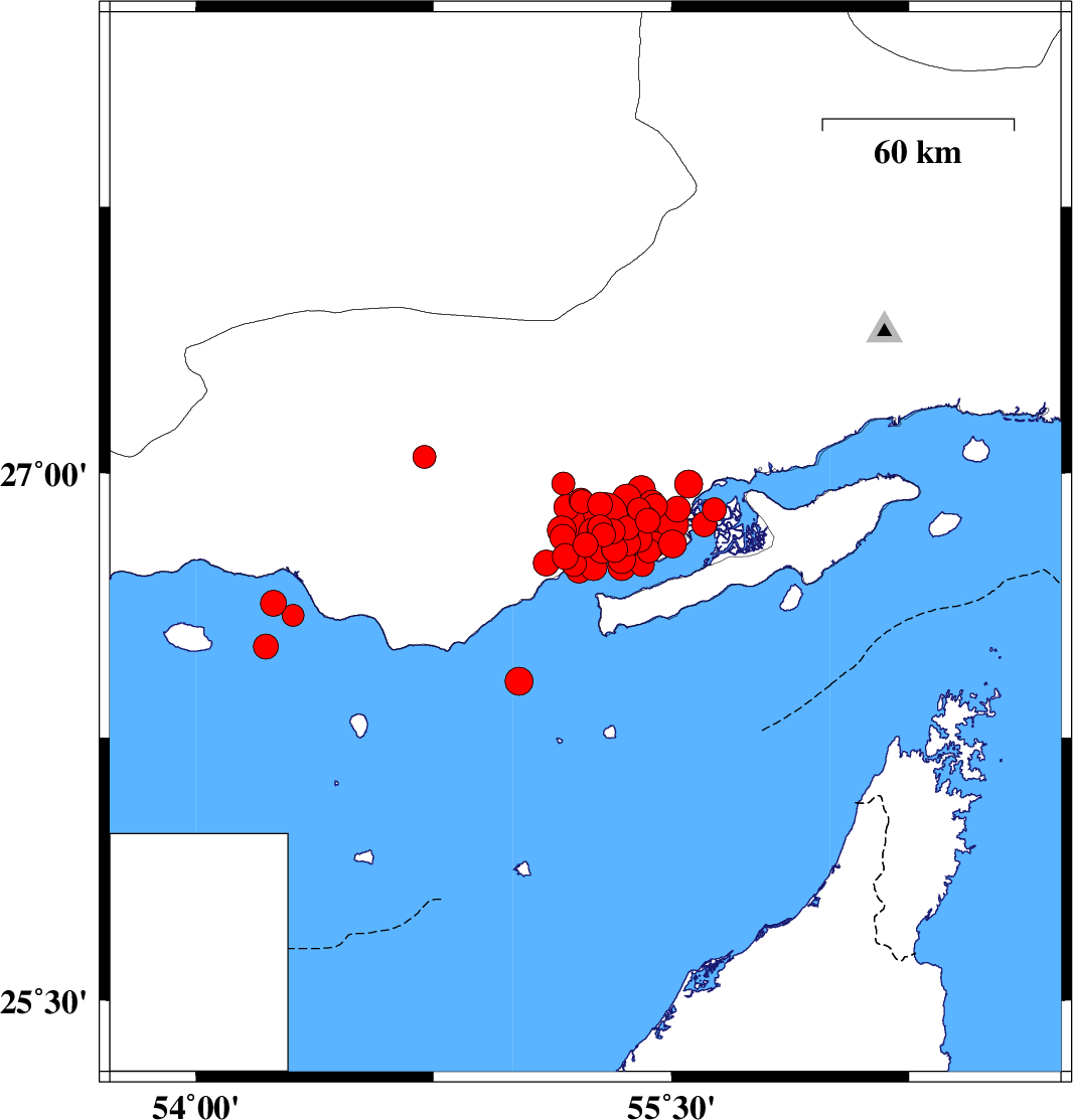 | 2022/07/01 | 00:44:42.6 | 05:14:42.6 | 26.598 | 54.307 | 21 | ML3.1 | Persian Gulf, 54 km -West of Bandar-e lengeh |