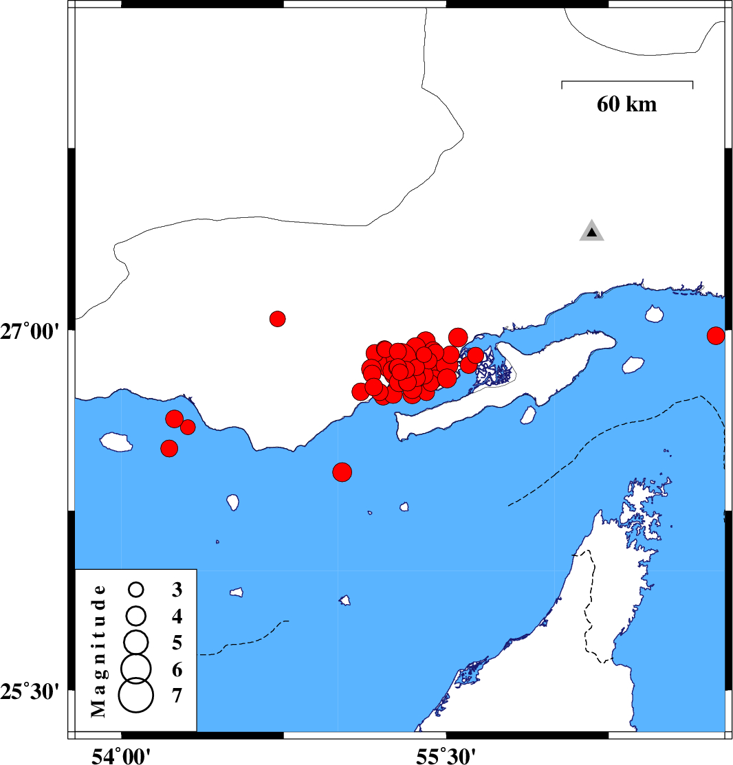 | 2022/07/01 | 00:44:42.6 | 05:14:42.6 | 26.598 | 54.307 | 21 | ML3.1 | Persian Gulf, 54 km -West of Bandar-e lengeh |