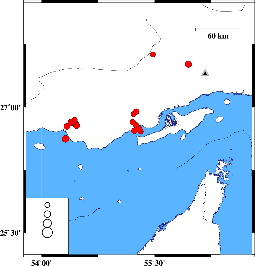| 2022/07/15 | 00:42:53.3 | 05:12:53.3 | 26.71 | 55.316 | 12 | ML3.2 | Persian Gulf, 51 km North-East of Bandar-e lengeh | ||