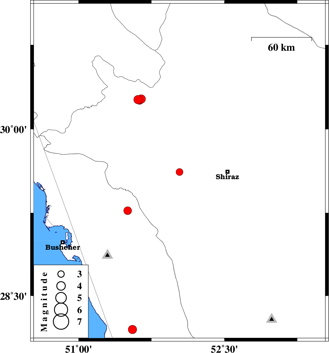 | 2022/06/24 | 06:34:39.7 | 11:04:39.7 | 29.269 | 51.504 | 12 | ML3.6 | Bushehr Province, 29 km -East of Borazjan |