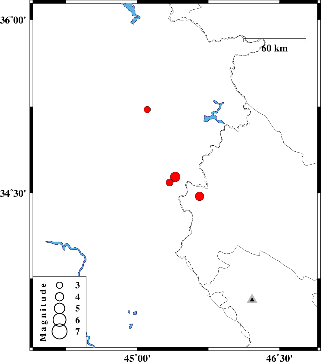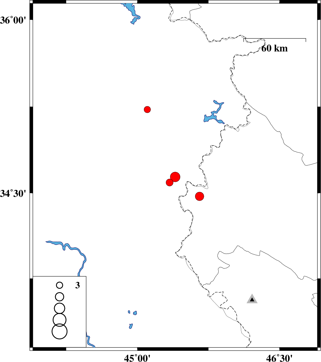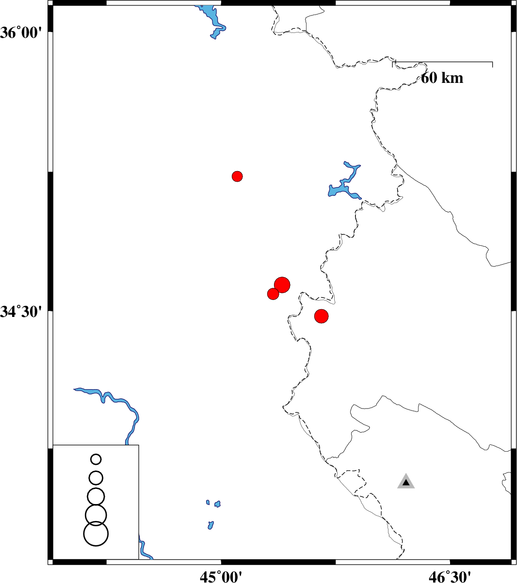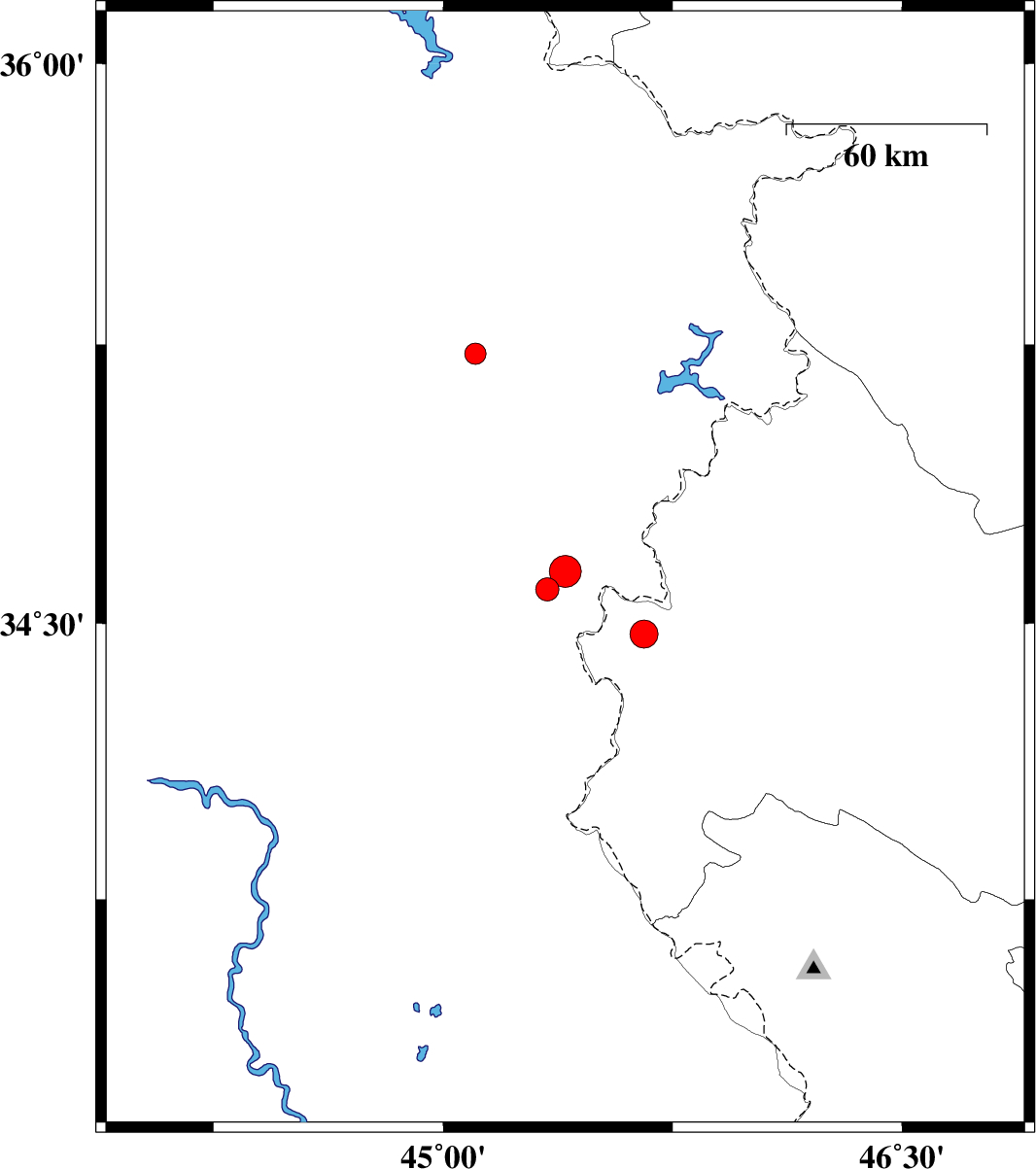 | 2022/07/18 | 21:47:47.5 | 02:17:47.5 | 34.591 | 45.341 | 12 | ML3.4 | Iraq, 24 km -West of Qasr-E-Shirin | ||