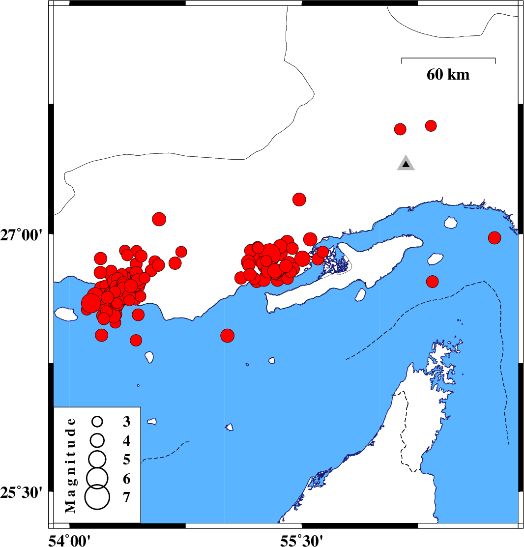 | 2022/06/21 | 07:05:05.4 | 11:35:05.4 | 26.692 | 54.303 | 19 | ML4 | Persian Gulf, 57 km South of Bastak | ||