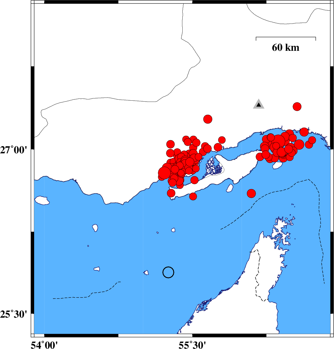 | 2022/06/16 | 20:53:11.2 | 01:23:11.2 | 26.659 | 54.345 | 20 | ML3.5 | Persian Gulf, 60 km South of Bastak | ||