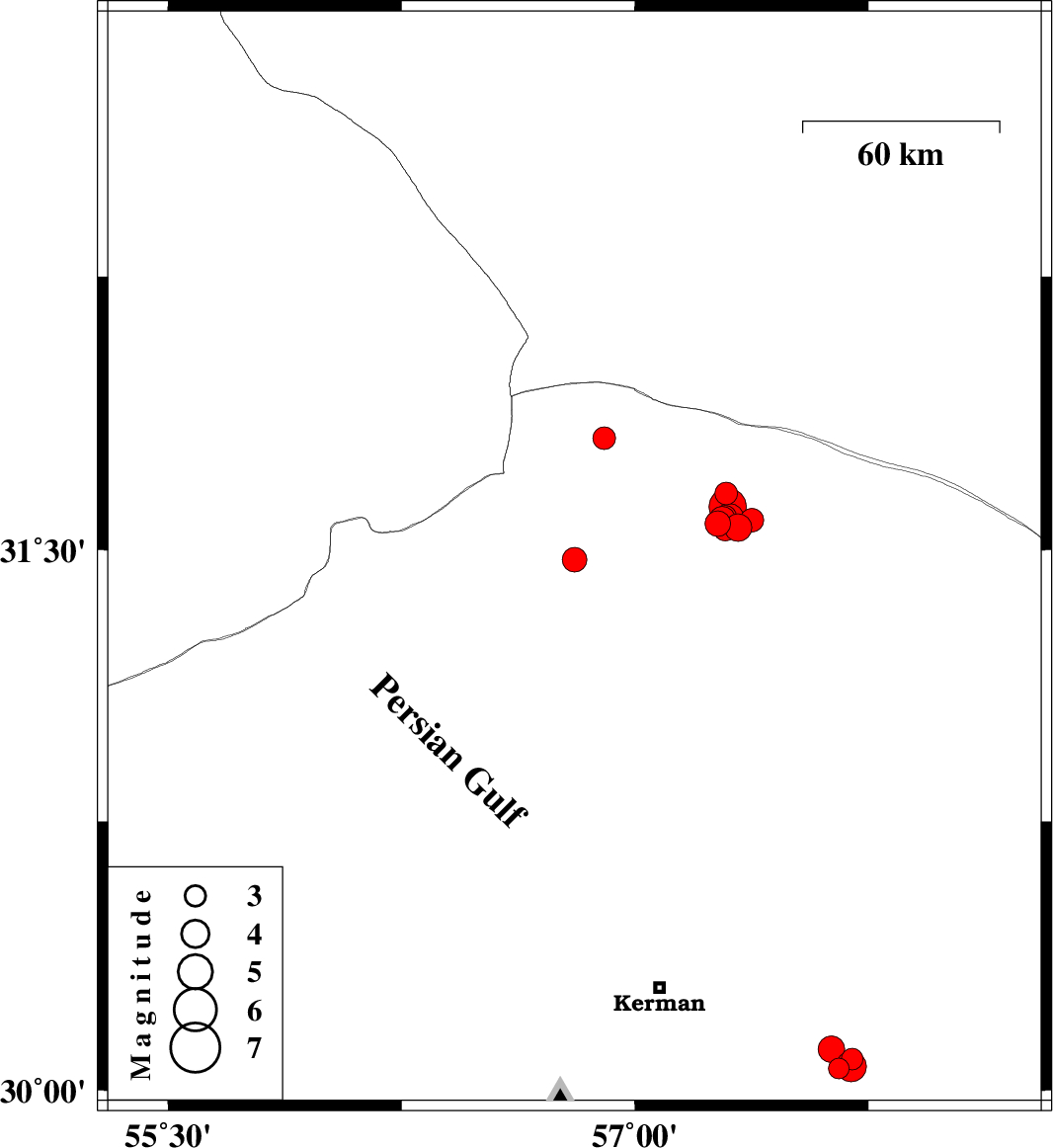 | 2022/06/26 | 15:39:00.2 | 20:09:00.2 | 31.588 | 57.303 | 12 | ML4.3 | Kerman Province, 59 km North-East of Ravar | ||