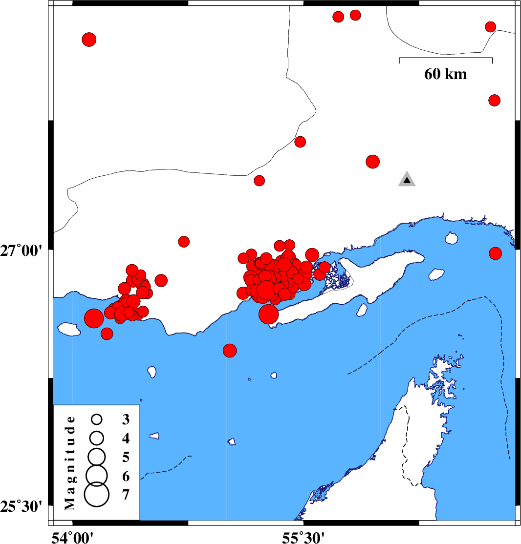 | 2022/06/24 | 01:27:26.6 | 05:57:26.6 | 26.657 | 54.354 | 12 | ML3.5 | Persian Gulf, 60 km South of Bastak |