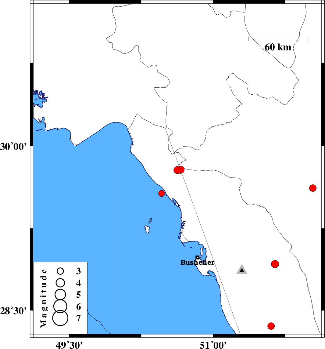 | 2022/08/06 | 03:43:59.5 | 08:13:59.5 | 29.784 | 50.66 | 12 | ML3.5 | Bushehr Province, 27 km North-East of Bandar-e genaveh | ||