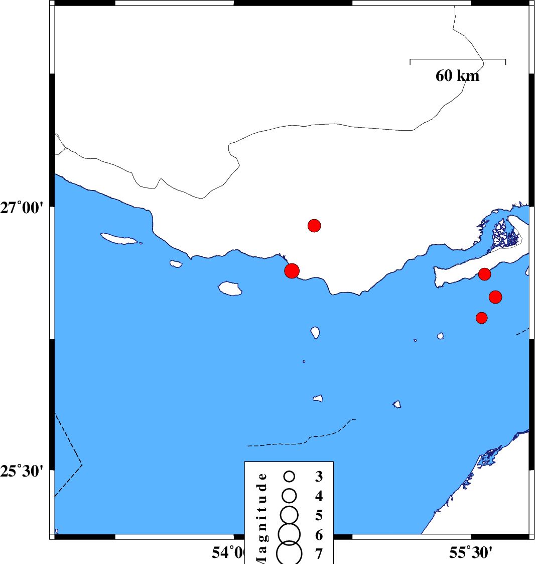 | 2022/07/15 | 00:42:53.3 | 05:12:53.3 | 26.71 | 55.316 | 12 | ML3.2 | Persian Gulf, 51 km North-East of Bandar-e lengeh |