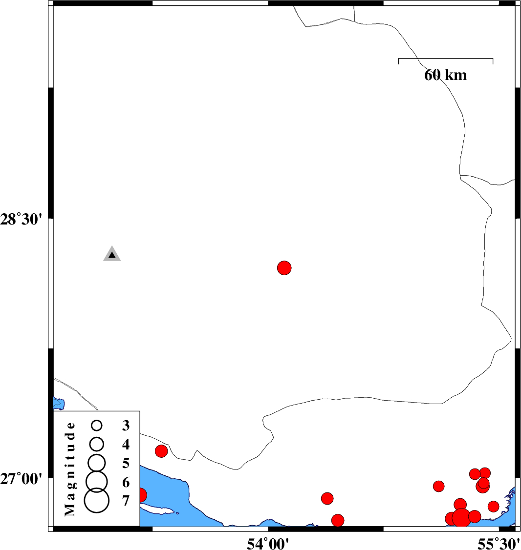 | 2022/07/19 | 18:18:27.2 | 22:48:27.2 | 26.76 | 55.195 | 12 | ML3.9 | Hormozgan Province, 43 km North-East of Bandar-e lengeh | ||