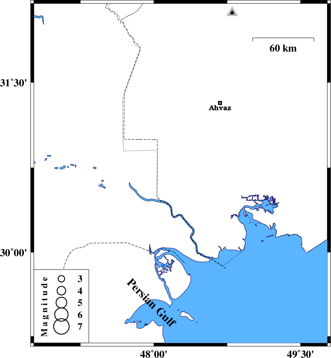 | 2022/08/25 | 19:58:31.1 | 00:28:31.1 | 30.69 | 48.274 | 12 | ML3.5 | Khoozestan Province, 30 km North of Khorramshahr |