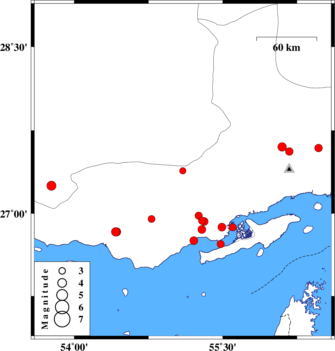 | 2022/08/26 | 03:05:54.1 | 07:35:54.1 | 27.601 | 56.099 | 7 | ML4 | Hormozgan Province, 50 km North-West of Bandar-e abbas | ||