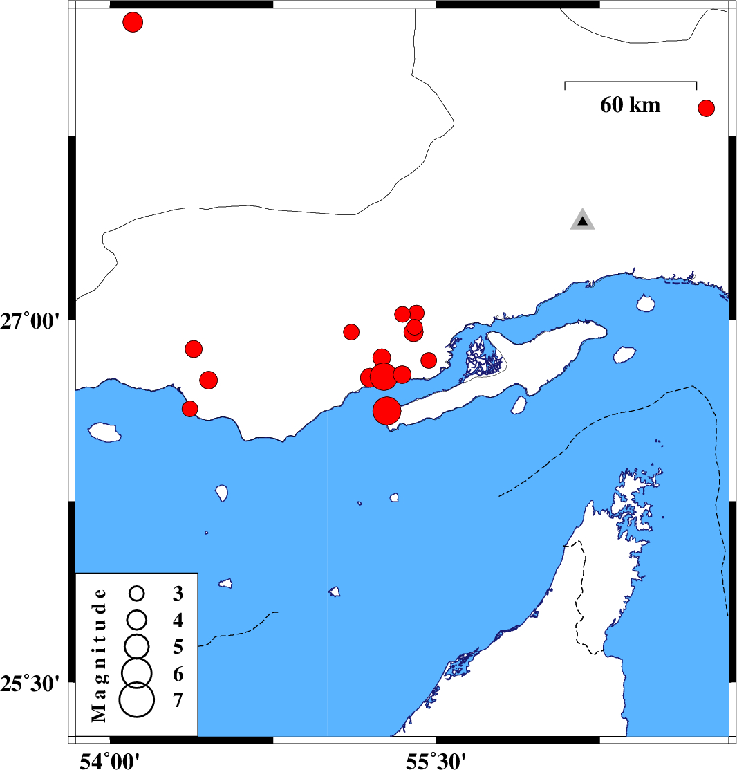 | 2022/07/23 | 21:05:25.1 | 01:35:25.1 | 26.831 | 55.464 | 12 | ML3.2 | Hormozgan Province, 70 km North-East of Bandar-e lengeh | ||