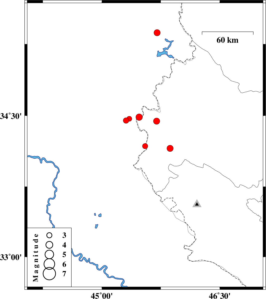 | 2022/08/05 | 09:07:31.3 | 13:37:31.3 | 34.485 | 45.475 | 12 | ML3.8 | Iraq, 10 km -West of Qasr-E-Shirin | ||