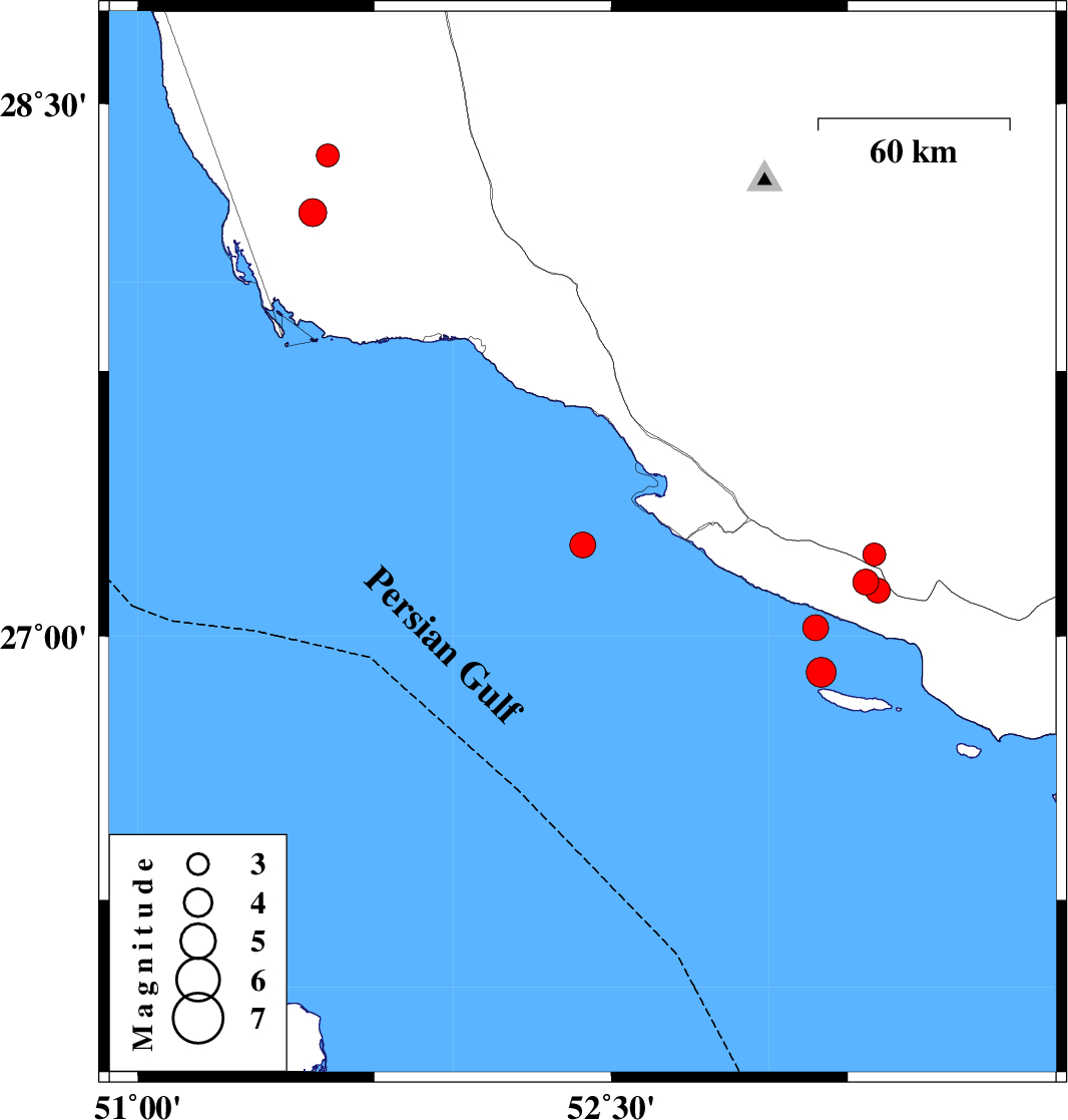 | 2022/06/29 | 00:01:18.6 | 04:31:18.6 | 28.195 | 51.554 | 19 | ML3.9 | Bushehr Province, 54 km South-East of Khormog | ||
