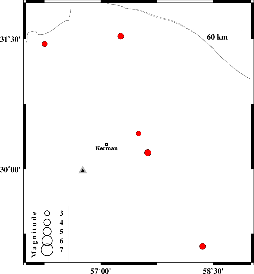 | 2022/09/04 | 21:23:08.1 | 01:53:08.1 | 30.191 | 57.626 | 12 | ML3.9 | Kerman Province, 54 km -East of Kerman | ||