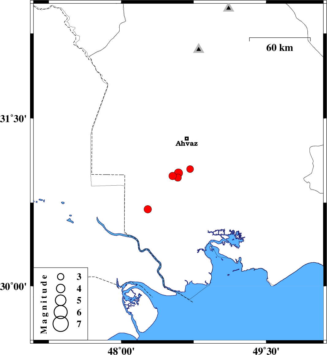 | 2022/08/25 | 19:58:31.1 | 00:28:31.1 | 30.69 | 48.274 | 12 | ML3.5 | Khoozestan Province, 30 km North of Khorramshahr |