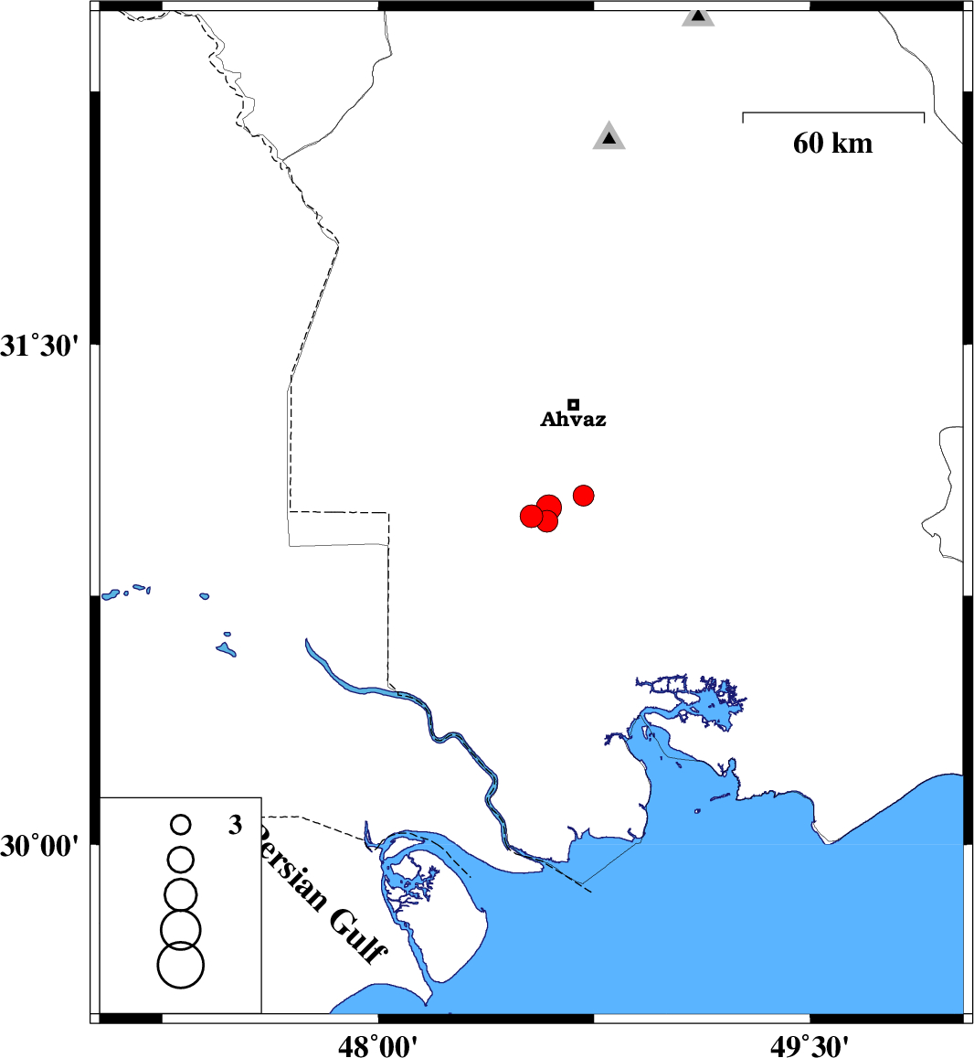 | 2022/09/11 | 15:19:06.7 | 19:49:06.7 | 31.049 | 48.713 | 12 | ML3.2 | Khoozestan Province, 30 km South of Ahvaz | ||
