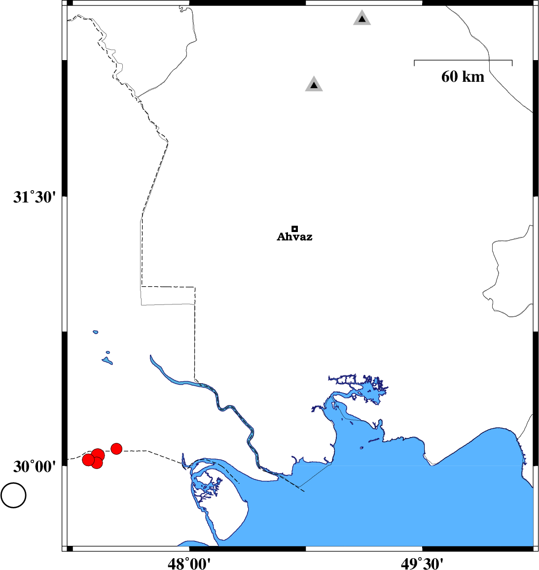 | 2022/08/25 | 19:58:31.1 | 00:28:31.1 | 30.69 | 48.274 | 12 | ML3.5 | Khoozestan Province, 30 km North of Khorramshahr |