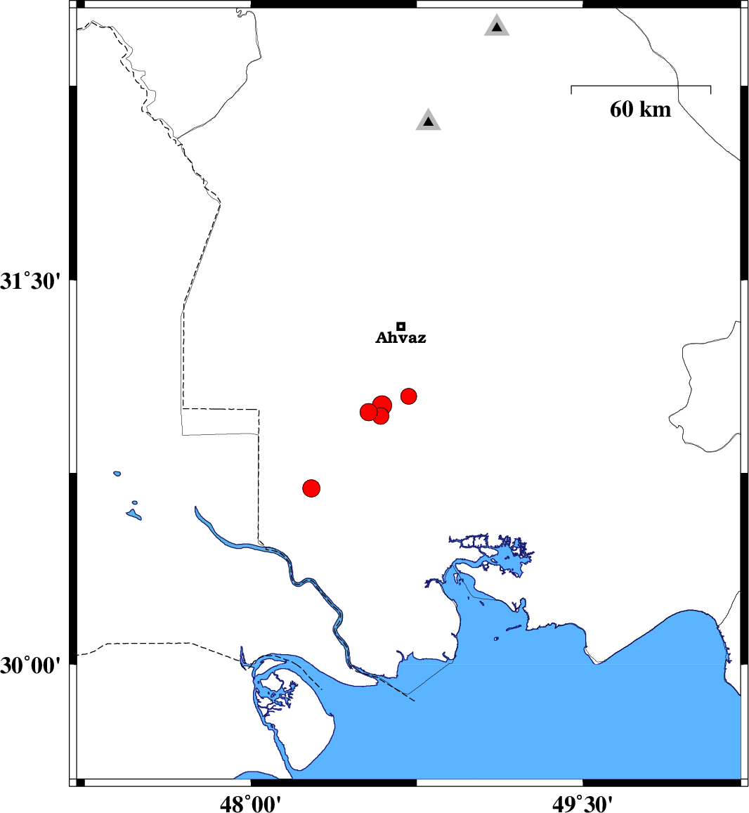 | 2022/09/11 | 15:19:06.7 | 19:49:06.7 | 31.049 | 48.713 | 12 | ML3.2 | Khoozestan Province, 30 km South of Ahvaz | ||