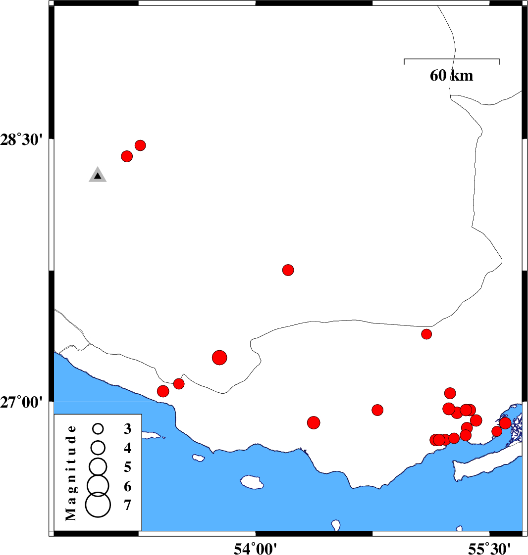 | 2022/09/14 | 20:20:49.3 | 00:50:49.3 | 26.778 | 55.154 | 15 | ML3.4 | Hormozgan Province, 41 km North-East of Bandar-e lengeh | ||