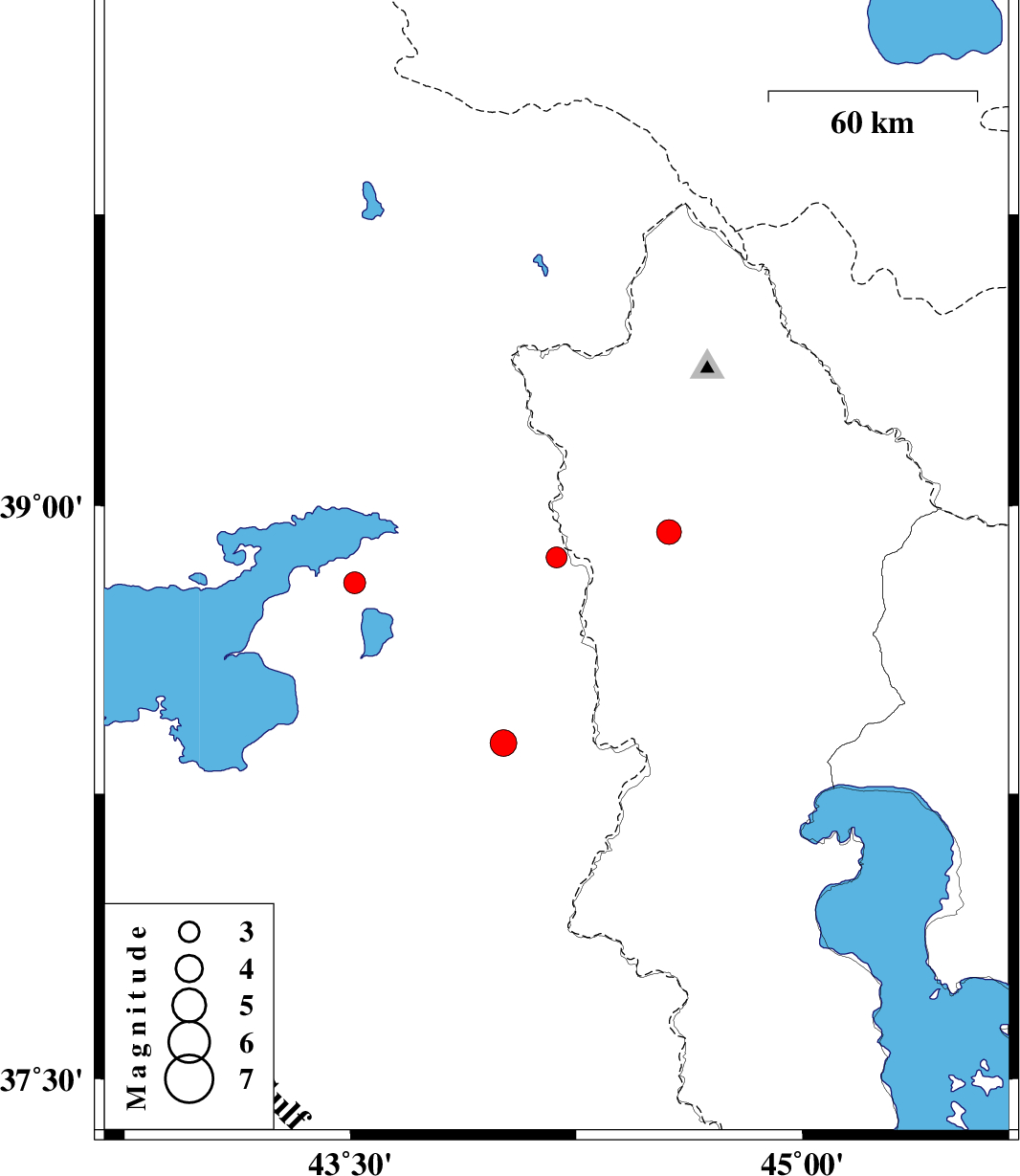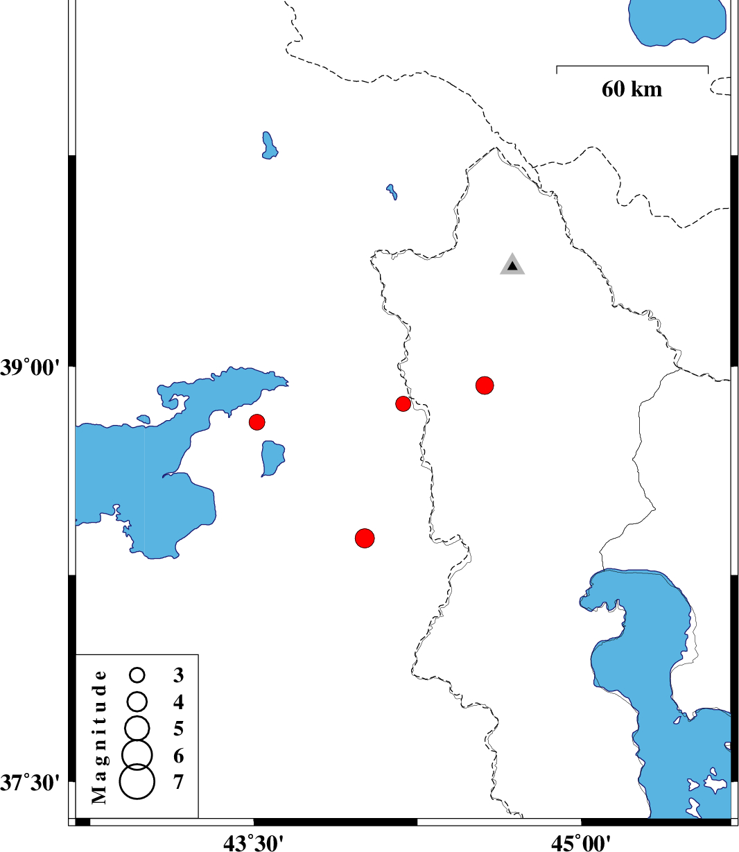 | 2022/09/05 | 08:49:16.2 | 13:19:16.2 | 38.383 | 44.008 | 12 | ML3.9 | Turkey, 70 km North-West of Salmas | ||