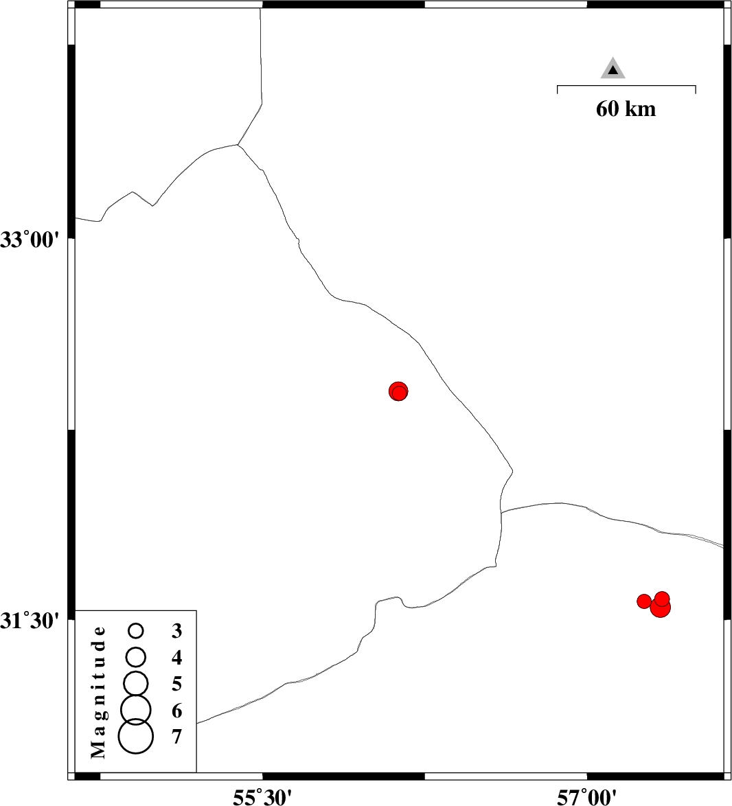 | 2022/09/28 | 02:41:49.9 | 06:11:49.9 | 31.582 | 57.346 | 12 | ML3.1 | Kerman Province, 62 km North-East of Ravar | ||