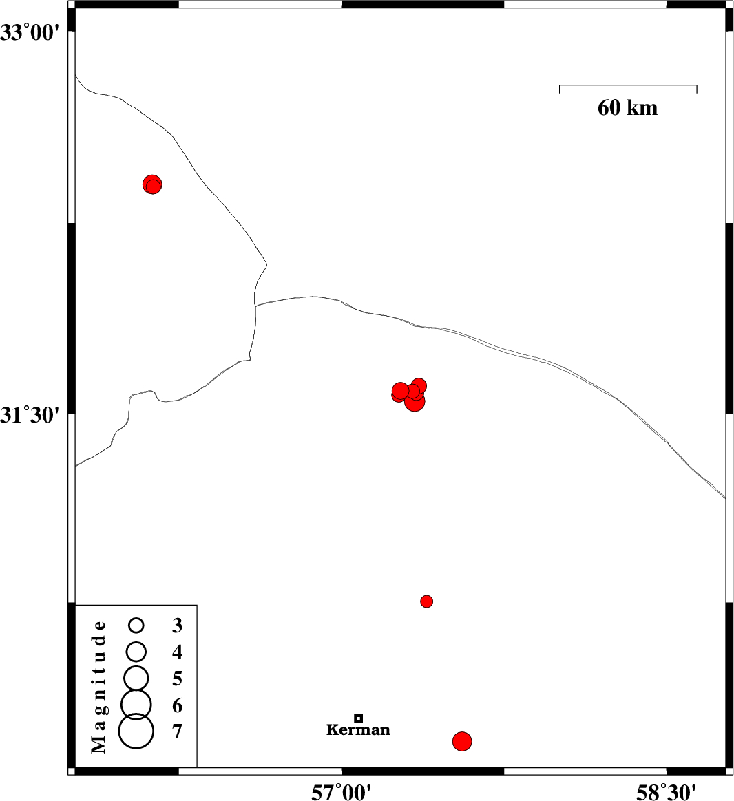 2022/09/25 06:10:19.8 09:40:19.8 31.54957.33820 ML4.3 Kerman Province, 59 km North-East of Ravar