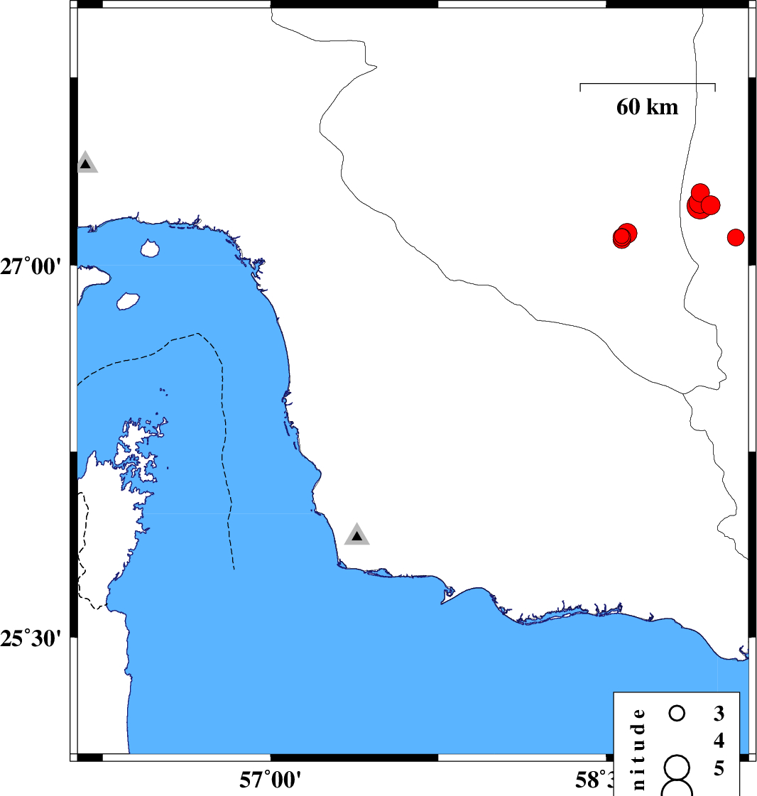 | 2022/09/25 | 23:04:25.4 | 02:34:25.4 | 27.675 | 56.522 | 12 | ML4.4 | Hormozgan Province, 60 km North-East of Bandar-e abbas | ||