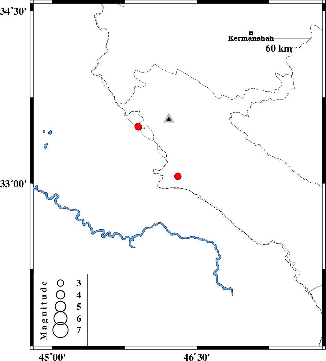 2022/10/25 | 13:20:08.5 | 16:50:08.5 | 33.063 | 46.303 | 12 | ML3.2 | Ilam Province, 14 km -East of Mehran |