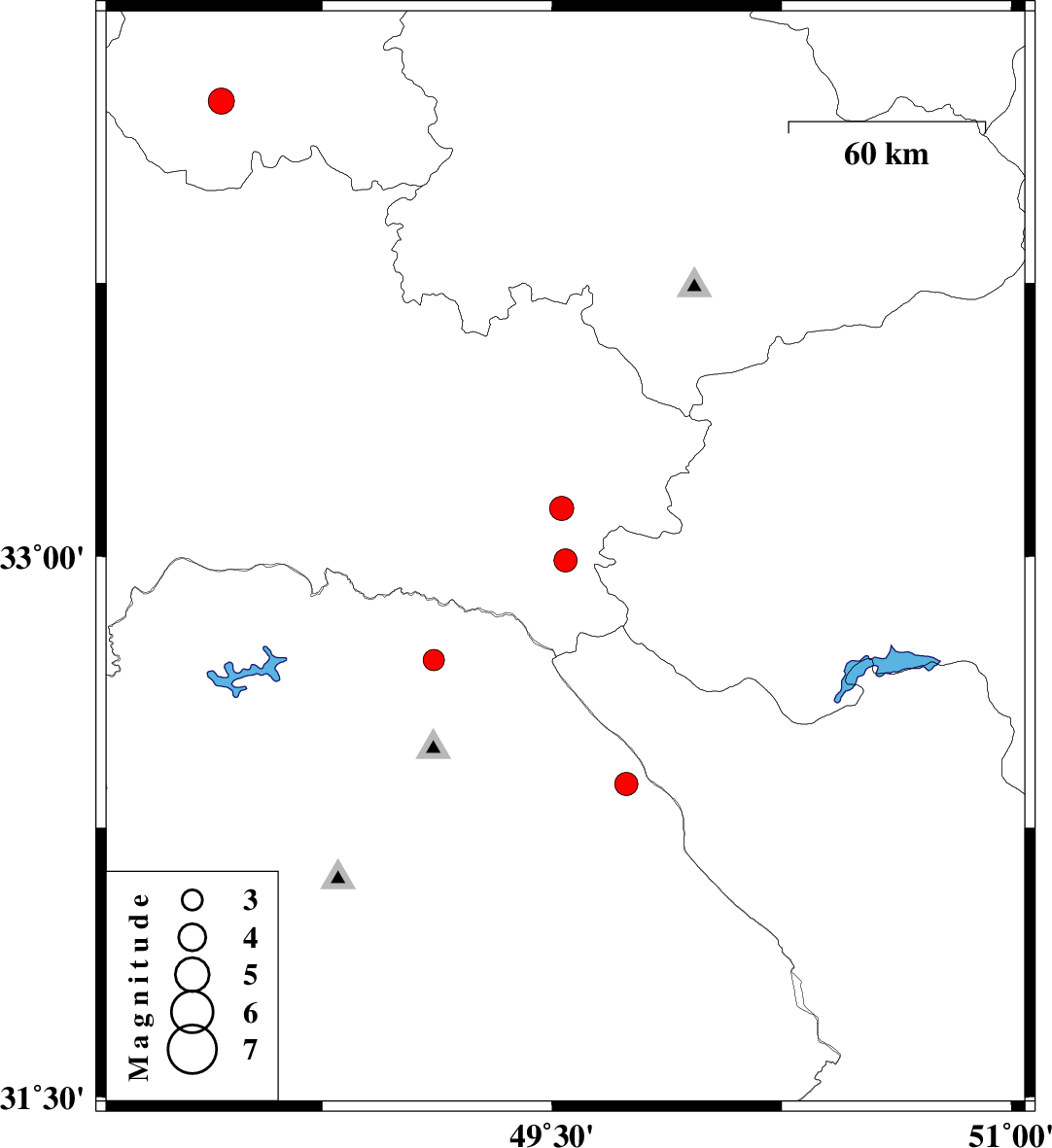 | 2022/10/28 | 09:30:50.2 | 13:00:50.2 | 32.714 | 49.114 | 10 | ML3.1 | Khoozestan Province, 36 km North of Lali | ||