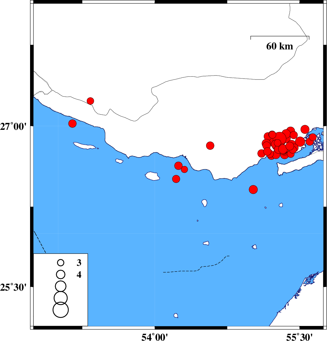 | 2022/07/02 | 09:15:46.8 | 13:45:46.8 | 26.838 | 55.155 | 20 | ML4.1 | Hormozgan Province, 46 km North-East of Bandar-e lengeh | ||