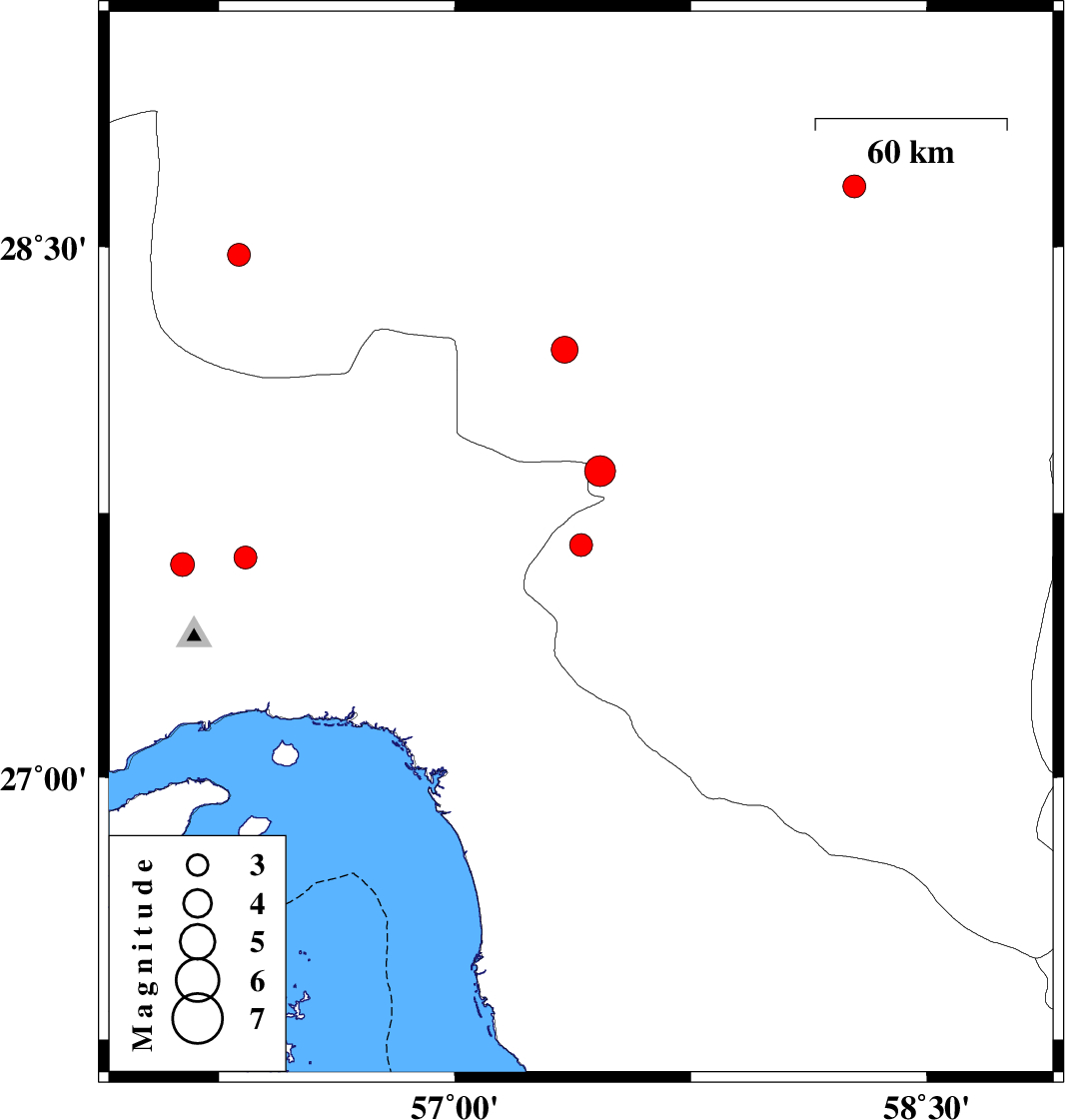 | 2022/07/01 | 14:04:21.1 | 18:34:21.1 | 27.868 | 57.462 | 12 | ML4.4 | Kerman Province, 25 km -West of Kahnuj | ||