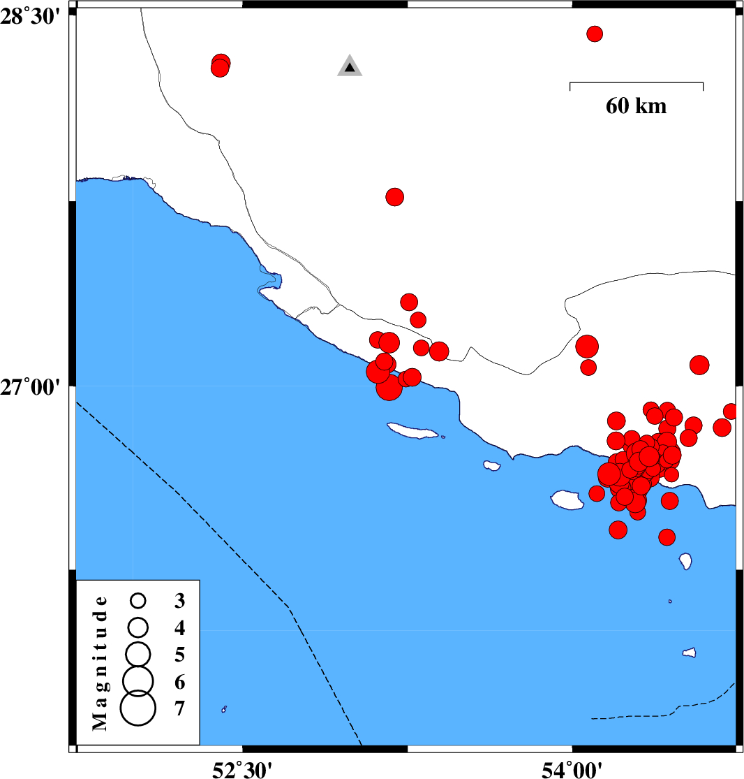 | 2022/06/21 | 07:05:05.4 | 11:35:05.4 | 26.692 | 54.303 | 19 | ML4 | Persian Gulf, 57 km South of Bastak | ||