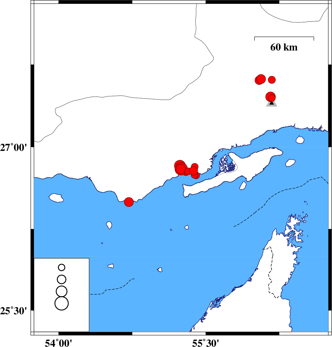 | 2022/11/02 | 08:07:05.8 | 11:37:05.8 | 26.497 | 54.715 | 12 | ML4.2 | Persian Gulf, 14 km -West of Bandar-e lengeh |