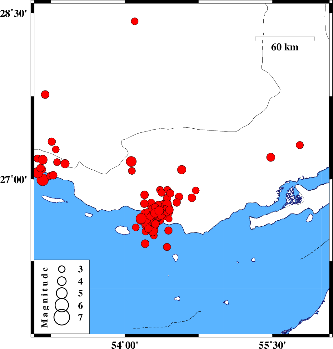 | 2022/06/21 | 07:05:05.4 | 11:35:05.4 | 26.692 | 54.303 | 19 | ML4 | Persian Gulf, 57 km South of Bastak | ||
