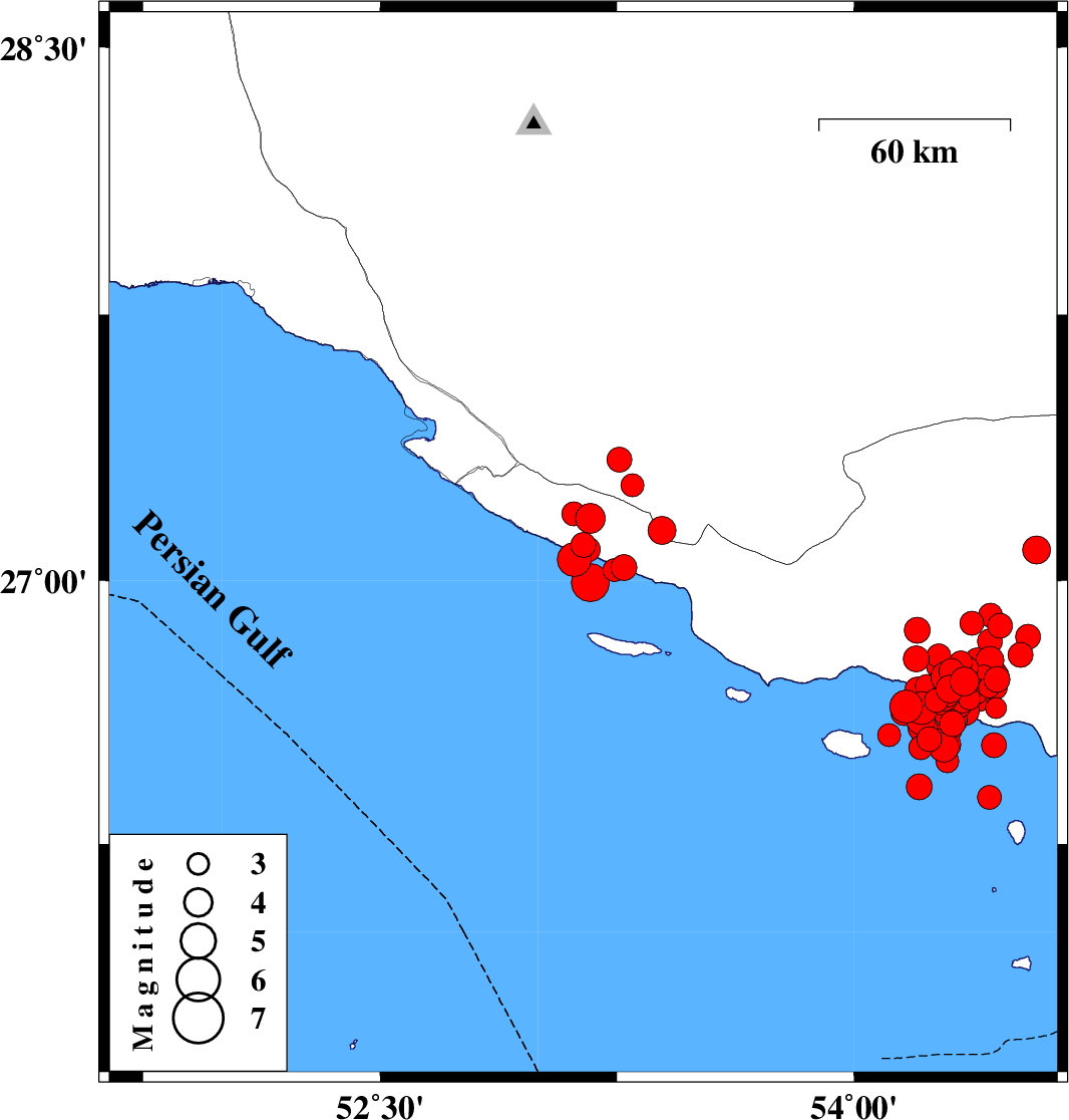 | 2022/06/21 | 07:05:05.4 | 11:35:05.4 | 26.692 | 54.303 | 19 | ML4 | Persian Gulf, 57 km South of Bastak | ||